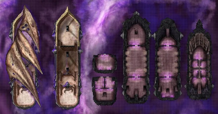 Sailors have sighted the Undead Airship and retired on the spot. How will your players react to the foul ship and its damned crew? Each map includes all ship decks, allowing you to set entire adventures aboard the vessel. Variations of this set include the original Void Ship, a Hell Airship, Ghost Ship, Lava Ship, and more – seven styles in all. I’ve also created 41 PNG assets of the different ship sections, weapons, and such, letting you customize or use them with other scenarios.